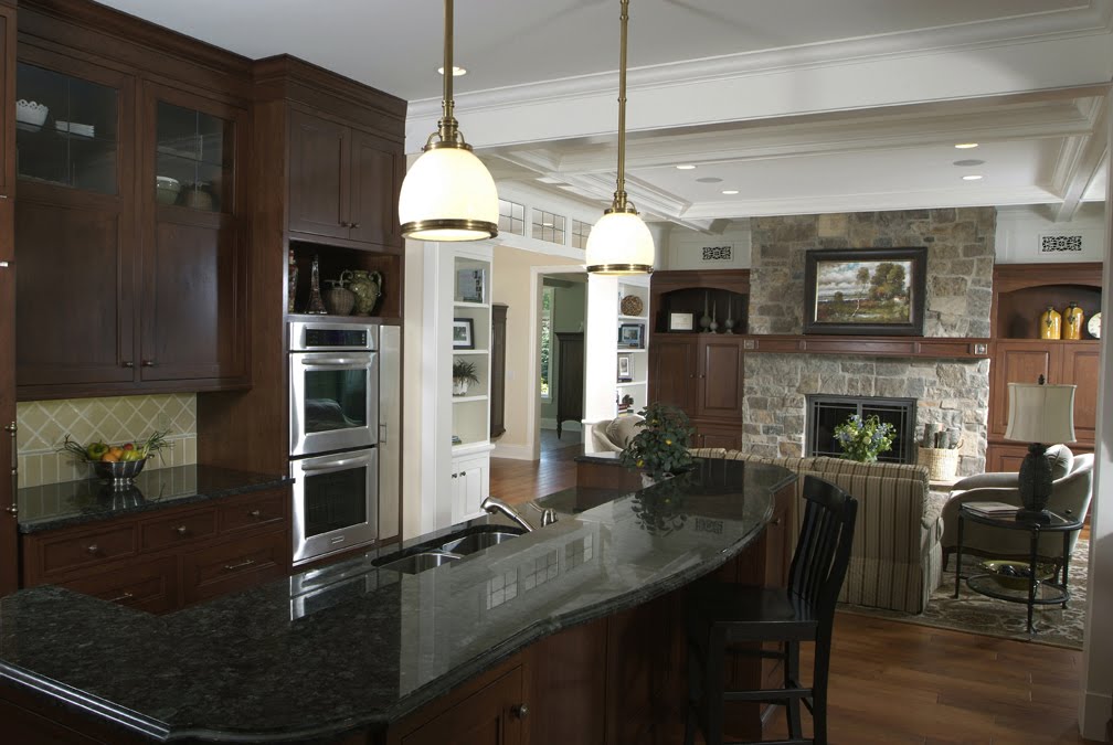 Design inspirations drawn from Western mountain residences and Heritage Hill lend distinctive, textured character to this home' gracious kitchen. Having a kitchen that feels more like a gathering space, with furniture-like characteristics, was important to the homeowners. Raised-panel, hand-finished cabinetry - mirroring the dining bay and music room - have inset doors. Lower perimeter cabinets - distressed alder with Tuscan glaze - are complemented by cream-hued, mullioned glass upper units echoing the home's retro transom windows. An appealing argyle backsplash offers visual interest, and the large island, topped by ivory, black, and deep coppery gold-tone granite, which complements the cabinets - serves as the kitchen's focal point. The island offers custom-designed features including a pull-out bookshelf for the homeowners' collection of cookbooks, as well as a pull-out table for extra seating. Panels conceal the kitchen's commercial-grade, state-of-the-art appliances.